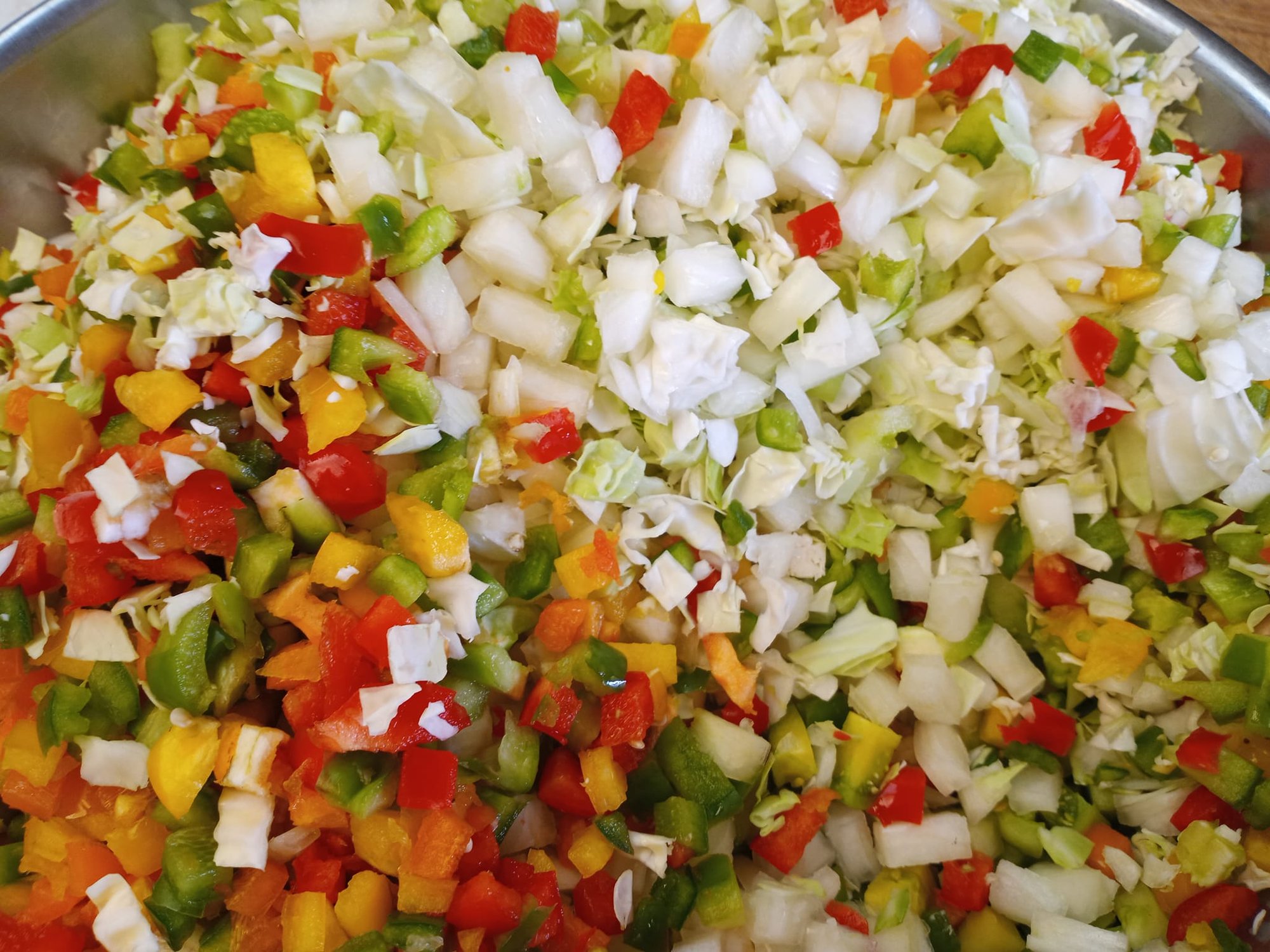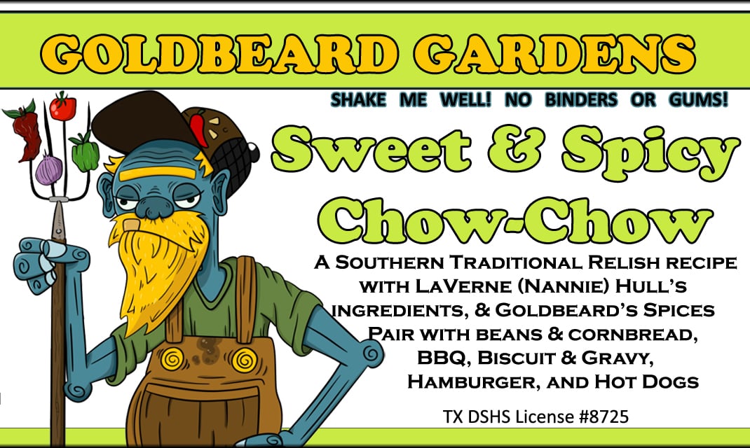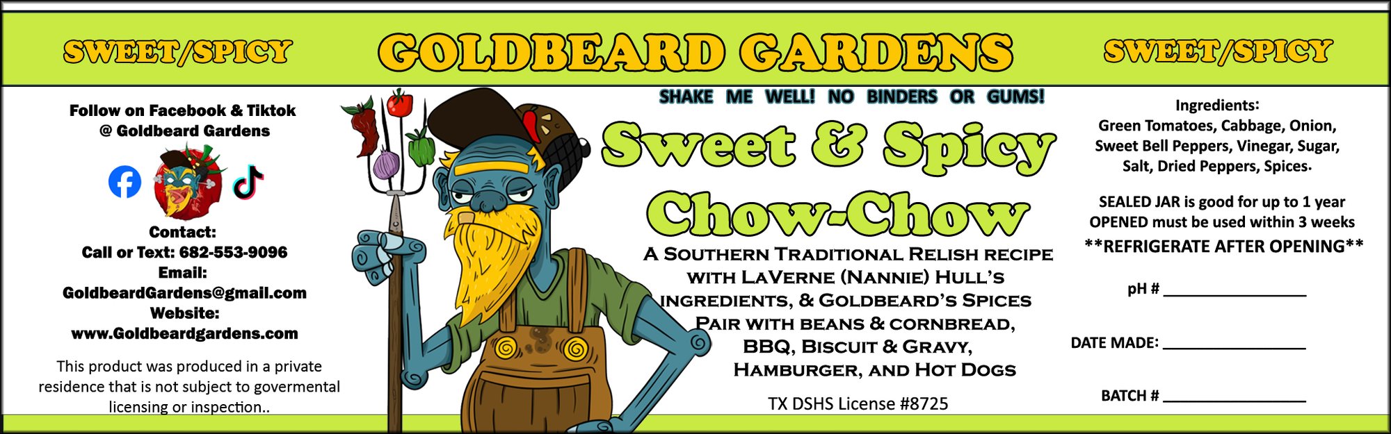 A spicy & sweet relish made with green tomatoes, onions, cabbage, and bell peppers with a pinch of pepper flakes for a little spice. Cooked in a brine that will knock your socks off. Good with Black Eye Peas and Cornbread, Hamburgers, Hot Dogs, Biscuit and Gravy, and many other dishes.